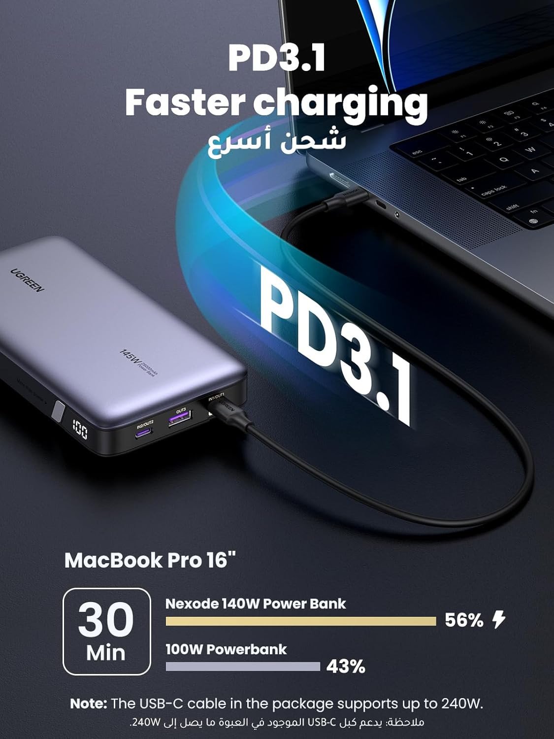 شحن سريع 145 واط, شاشة LED رقمية ذكية, كابل USB-C إلى USB-C 100 واط
